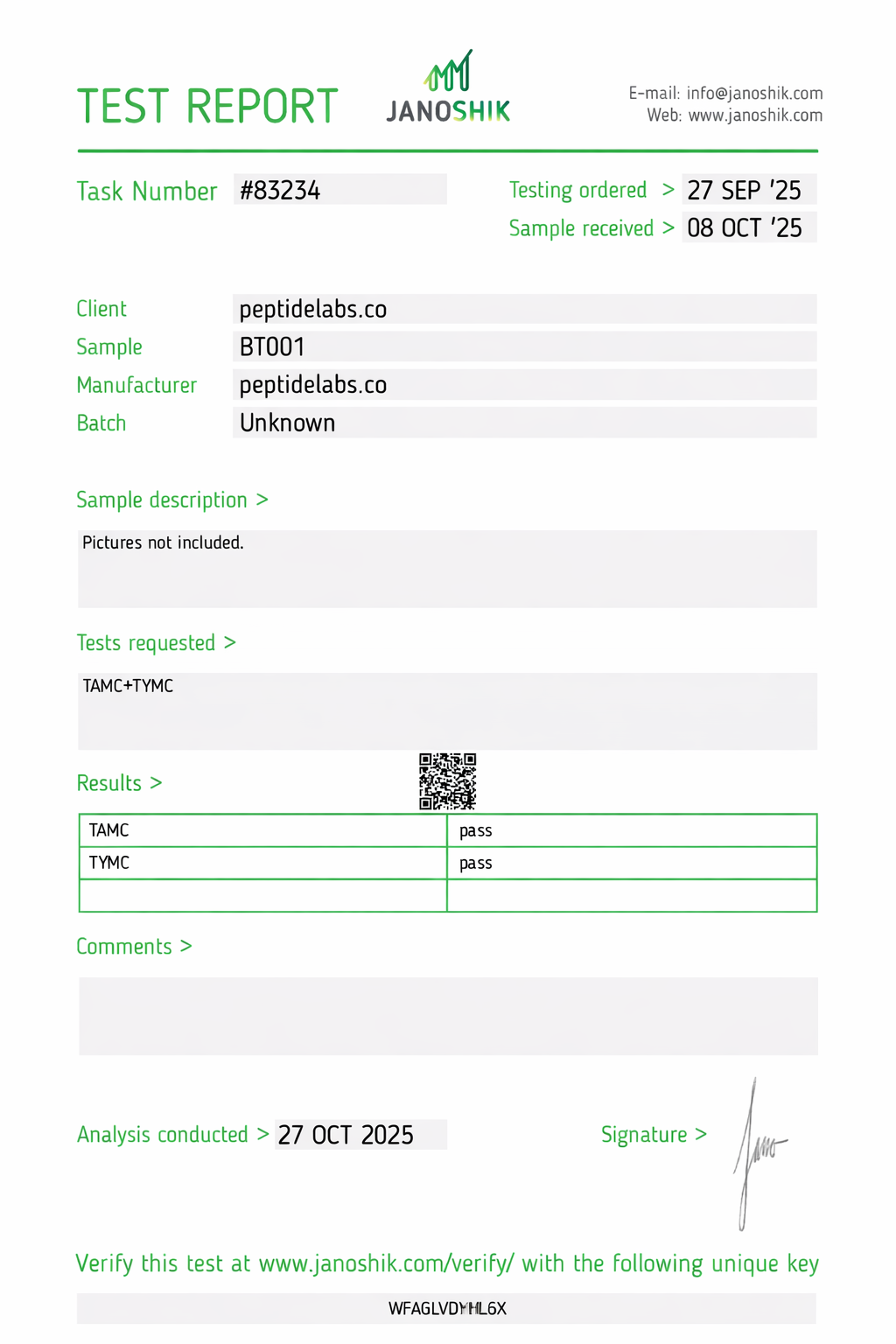 Peptide Labs products are manufactured to research-grade specifications, typically targeting ≥98% purity by HPLC unless otherwise stated. Exact purity results are documented on the corresponding batch COA.