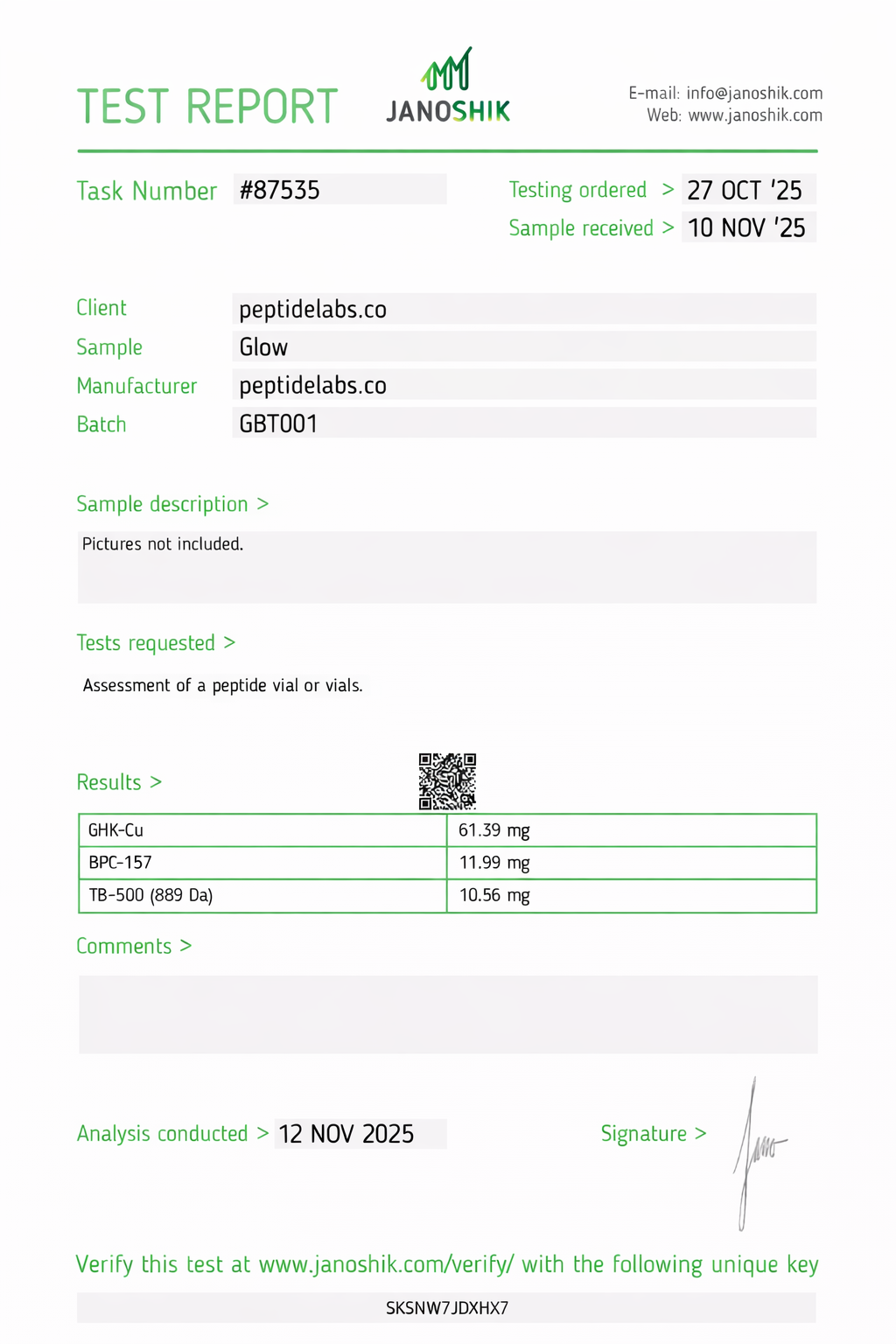 Peptide Labs products are manufactured to research-grade specifications, typically targeting ≥98% purity by HPLC unless otherwise stated. Exact purity results are documented on the corresponding batch COA.