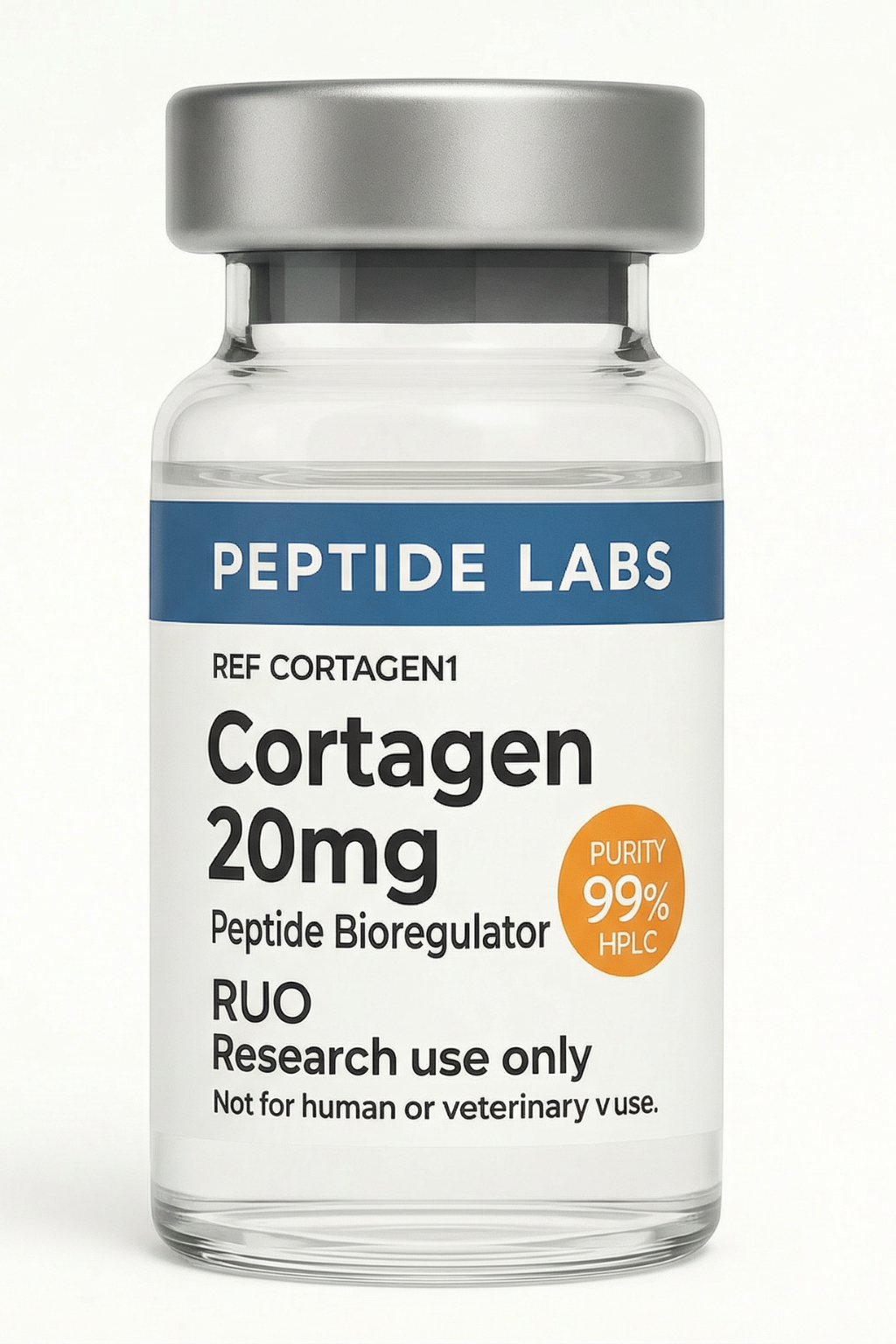 Cortagen Peptide 20mg is a research-grade peptide compound for laboratory use only. 99%+ purity, HPLC verified. For research purposes only. Not for human or veterinary use.