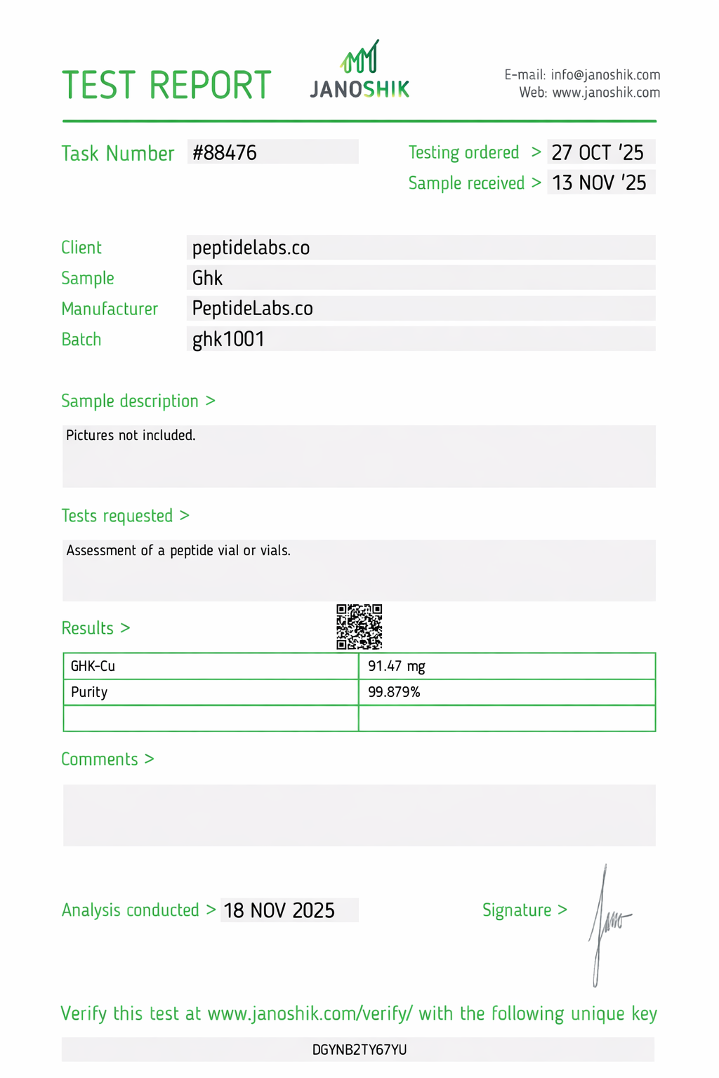 Peptide Labs products are manufactured to research-grade specifications, typically targeting ≥98% purity by HPLC unless otherwise stated. Exact purity results are documented on the corresponding batch COA.
