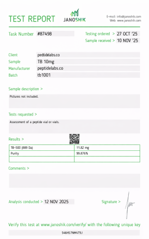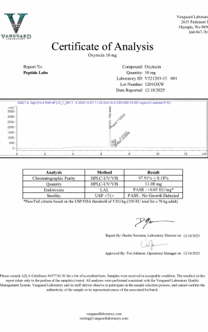 Peptide Labs products are manufactured to research-grade specifications, typically targeting ≥98% purity by HPLC unless otherwise stated. Exact purity results are documented on the corresponding batch COA.