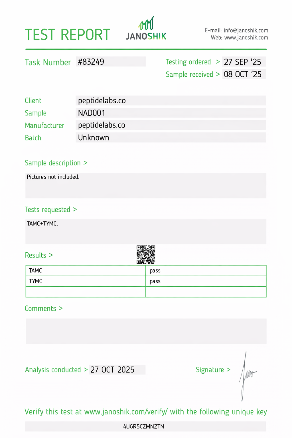 NAD+ is a research-grade coenzyme essential for cellular energy production and metabolic function. It is studied for its role in mitochondrial health, DNA repair, and potential impact on aging and longevity. For laboratory research use only.