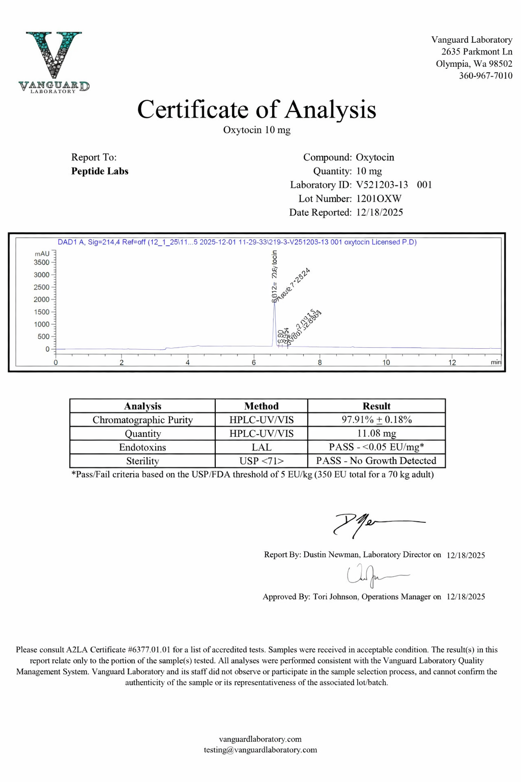 PassedConfirms molecular sequence and structural integrity using analytical verification methods to ensure the correct compound is present in each batch.